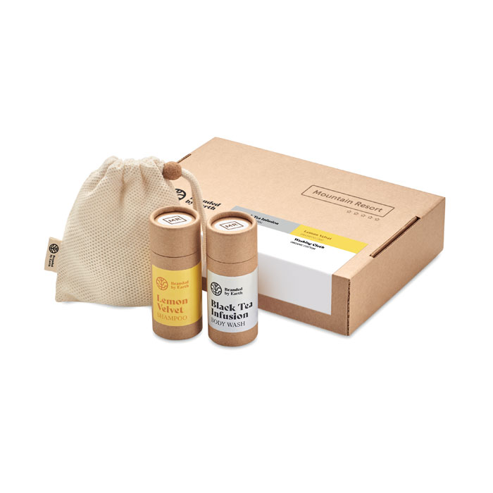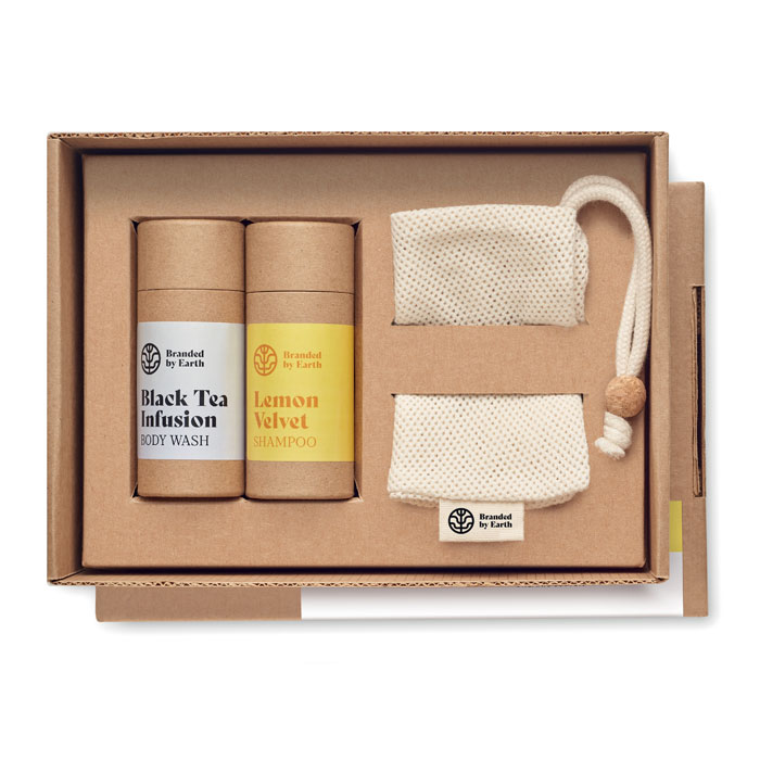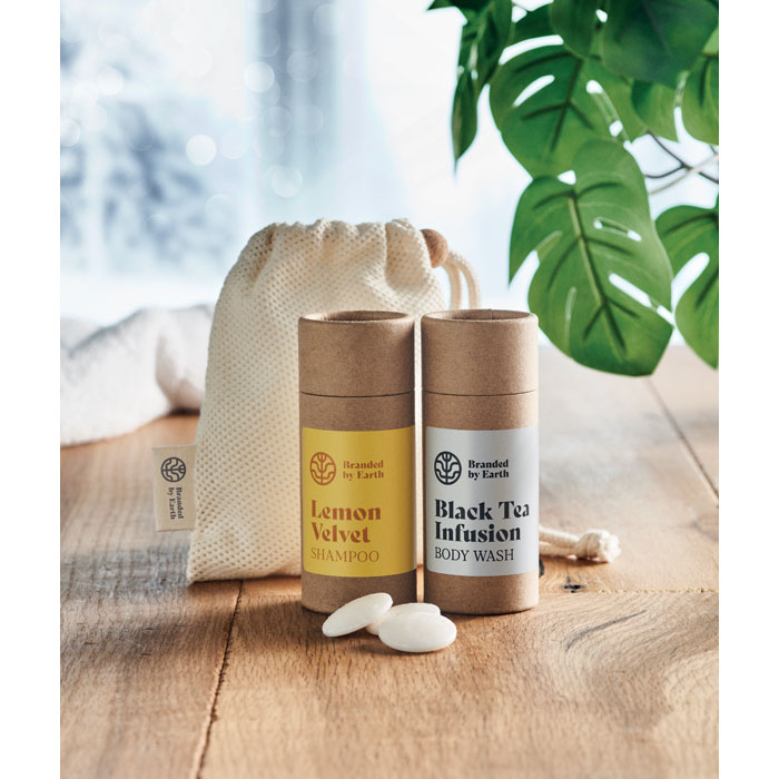 Unisex On the Go gift set by Branded By Earth. Includes 24 vegan 4gr of body wash, shampoo and a washing cloth in organic cotton. All pieces packed in tube. Presented in recycled paper box. Made in EU.